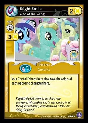 Here on this page you'll find an overview of all My Little Pony Bright Smile, One Of The Gang CCG Cards, with a total of 1 release. You can click on the Bright Smile, One Of The Gang CCG Cards images to zoom in or click on any of the links under the images to see more releases of that type.