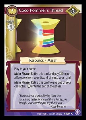 Here on this page you'll find an overview of all My Little Pony Coco Pommel's Thread CCG Cards, with a total of 1 release. You can click on the Coco Pommel's Thread CCG Cards images to zoom in or click on any of the links under the images to see more releases of that type.