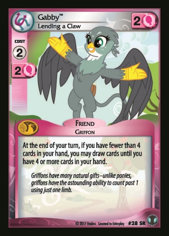 Here on this page you'll find an overview of all My Little Pony Gabby, Lending A Claw CCG Cards, with a total of 1 release. You can click on the Gabby, Lending A Claw CCG Cards images to zoom in or click on any of the links under the images to see more releases of that type.