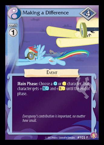 Here on this page you'll find an overview of all My Little Pony Making A Difference CCG Cards, with a total of 1 release. You can click on the Making A Difference CCG Cards images to zoom in or click on any of the links under the images to see more releases of that type.