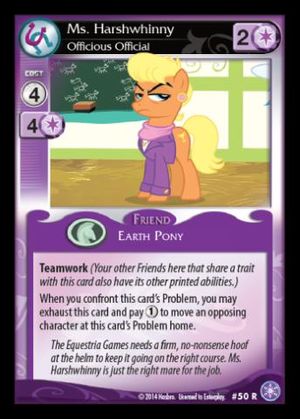 Here on this page you'll find an overview of all My Little Pony Ms. Harshwhinny, Officious Official CCG Cards, with a total of 2 releases. You can click on the Ms. Harshwhinny, Officious Official CCG Cards images to zoom in or click on any of the links under the images to see more releases of that type.